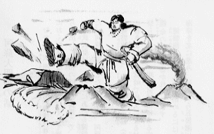 二人は火を噴く山、阿蘇一帯に新天地を求めて進みます。その頃の阿蘇は阿蘇谷、南郷谷(なんごうだに)とも広々と水をたたえた大きな湖でした。この湖の水を流し出して開拓しようと一大決心をしました。