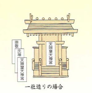 御札の納め方は宮形の造りによって、それぞれ異なります。一社式の神棚の場合。 |