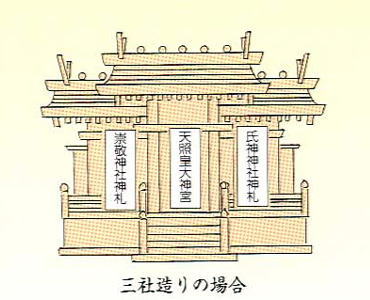 御札の納め方は宮形の造りによって、それぞれ異なります。三社式の神棚の場合。 |
