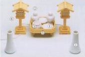 最後にお供えを並べ、完成です。米・酒・塩・水 (・榊) を供えます。 写真のように専用の祭器具を揃えられれば結構ですが、無い場合は、小皿に米と塩、コップまたは湯飲み茶碗に酒と水をお供えしても結構です。 |